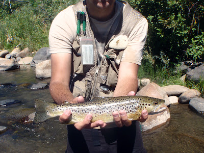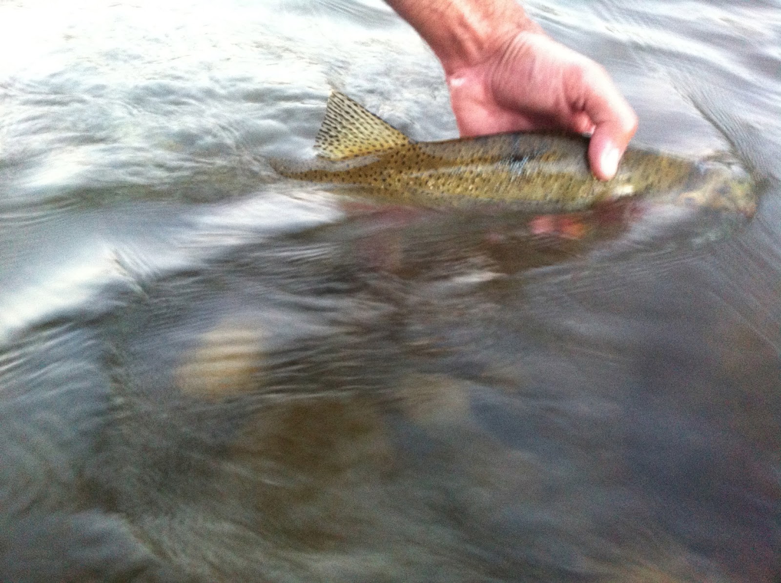 15 minutes after I caught this little brown, I hooked Hank. 25″+ brown with attitude. Saw him 3 times before he spit the 2-bit hooker out of his mouth. Lost him when he figured out where I was and headed straight for the other side of the river in fast water. He darted from big rock to big rock and covered an insane amount of water in about 6 seconds.