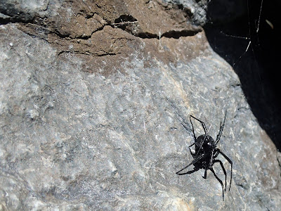 This female black widow was perched about 12″ up a sheer rock face jutting out of water that came up to my chest. Her nest was chock full of stonefly husks, an admirable strategy. The protein diet is doing a body good. This picture needed an object for scale reference. We killed between 50 and 60 black widows outside my last home in northwest Reno in one summer, and this was hands down the biggest widow I have ever seen.
